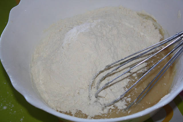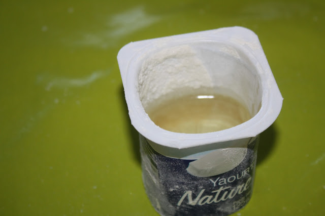 Dans un saladier, j’ai ajouté le yaourt, les sucres, huiles, farine,  levure et œufs et on mélange jusqu’à obtenir une pâte homogène.