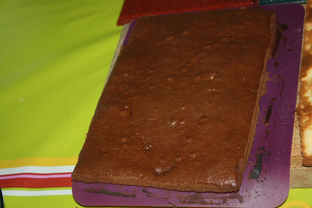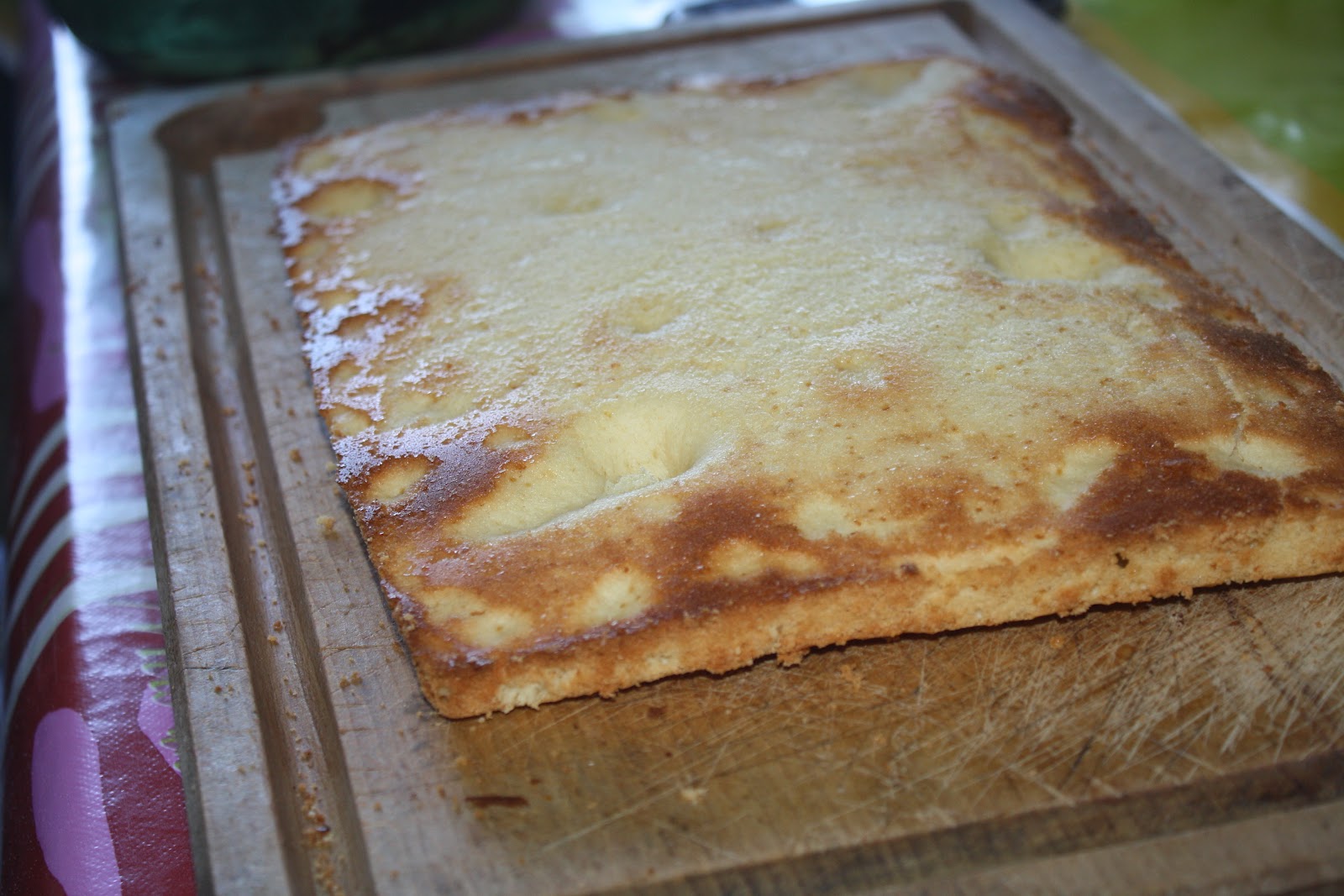 Et sortez du four, on va laisser refroidir  (comme vous voyez, mon gâteau n’est pas assez épais pour être coupé en deux (horizontalement), je vais donc je coupé en deux, verticalement.)