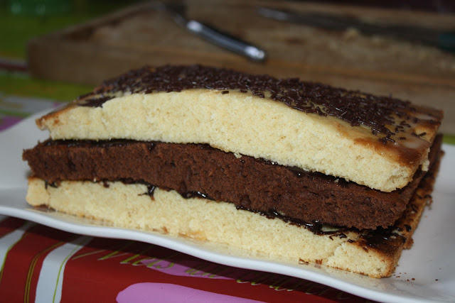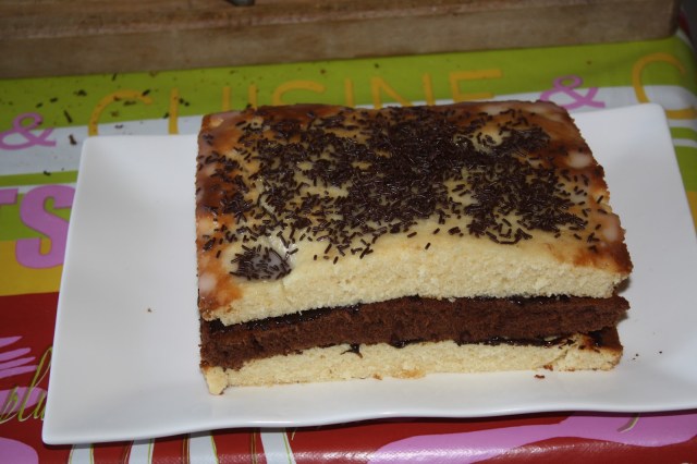 Bon comme je vous ai dis, j’ai coupé le gâteau en deux, donc on mets le gâteau vanillé,   une couche de pâte chocolaté, gâteau chocolat, pâte chocolaté  et pour finir gâteau vanillé.