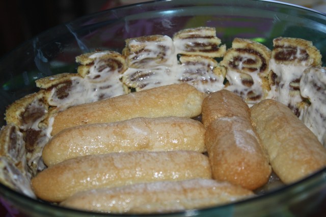On ajoute les biscuits à la cuillères qu’on trempe dans le sirop de poire