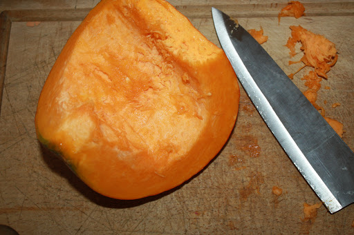 Commençons par couper le potiron, le couper en petit bout et les faire cuire