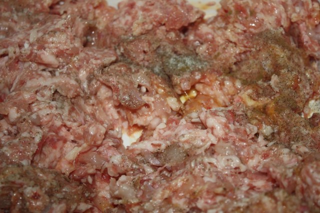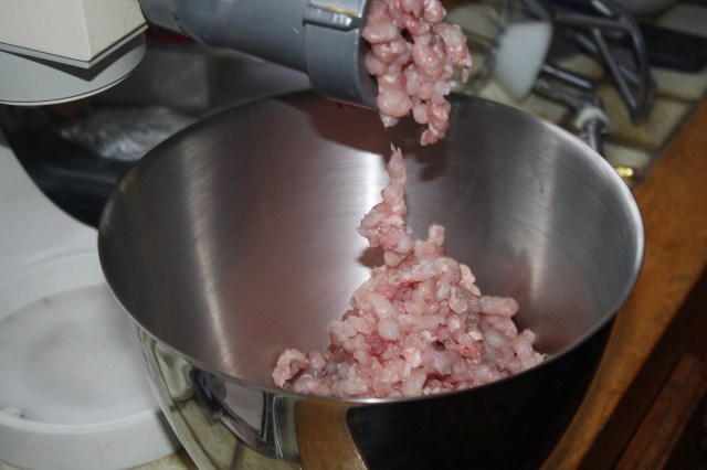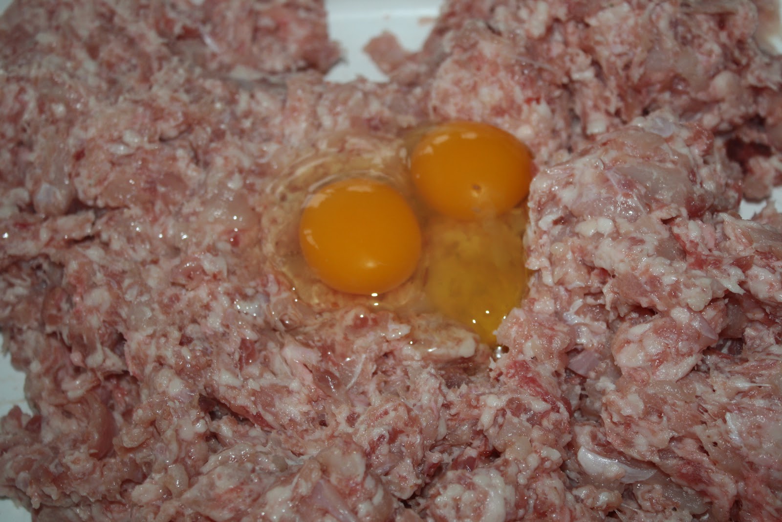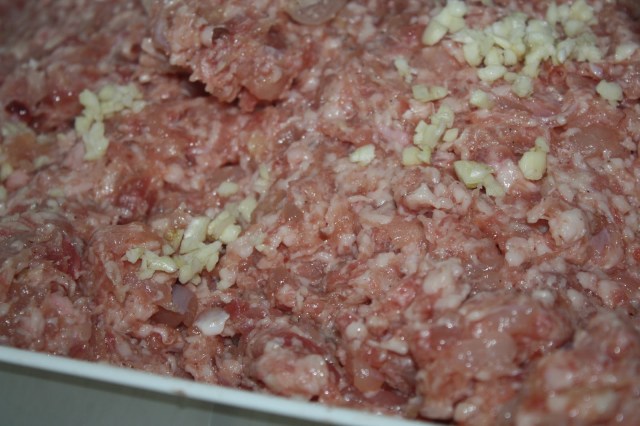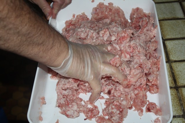 Mélangeons le hachis de lapin avec la gorge et la poitrine.