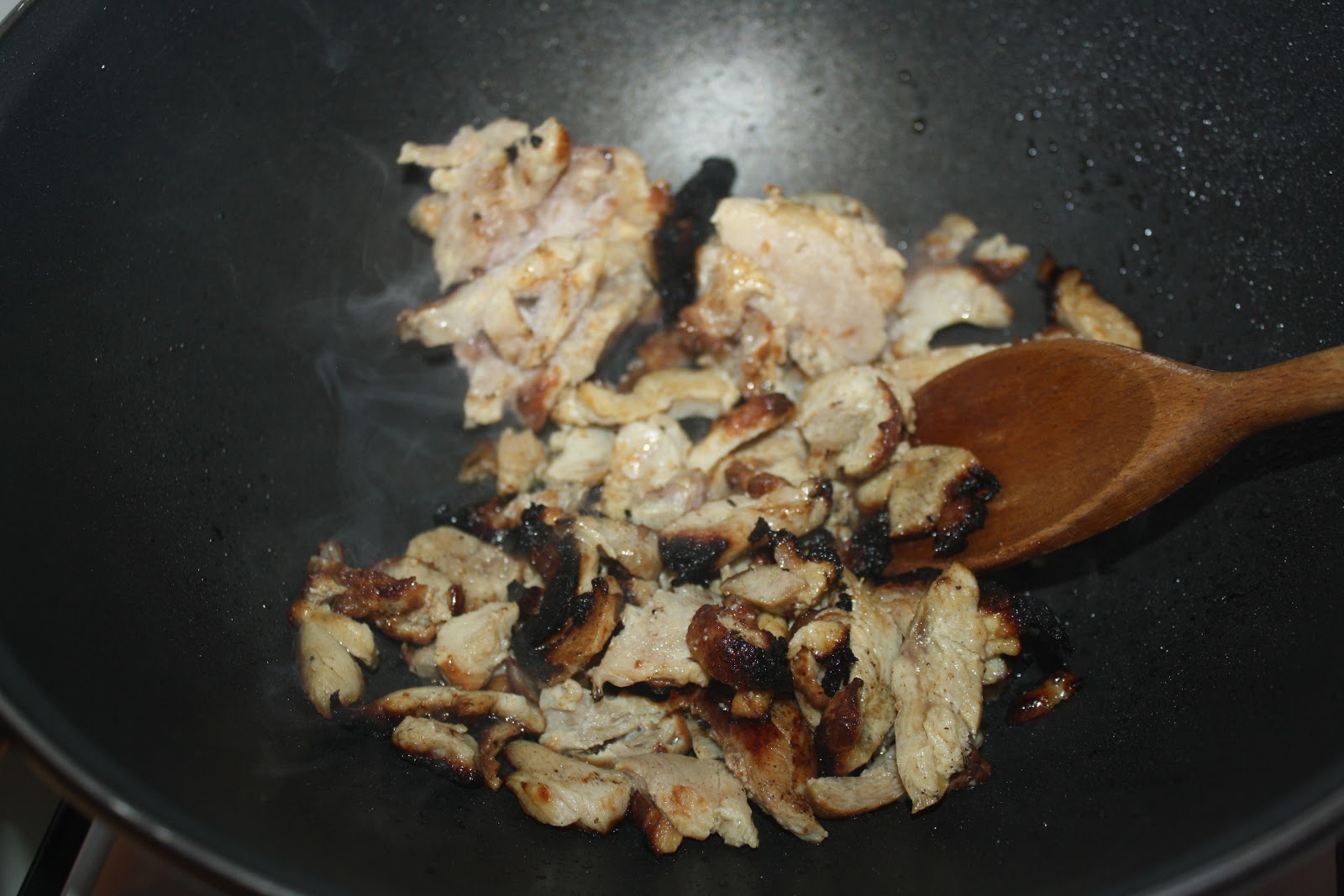 Commençons par faire revenir les émincés  de poulet avec un peu d’huile d’olive dans une poêle.
