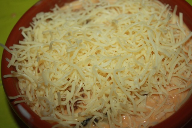 Et recouvrons la mozzarella et le poulet de ce mélange.