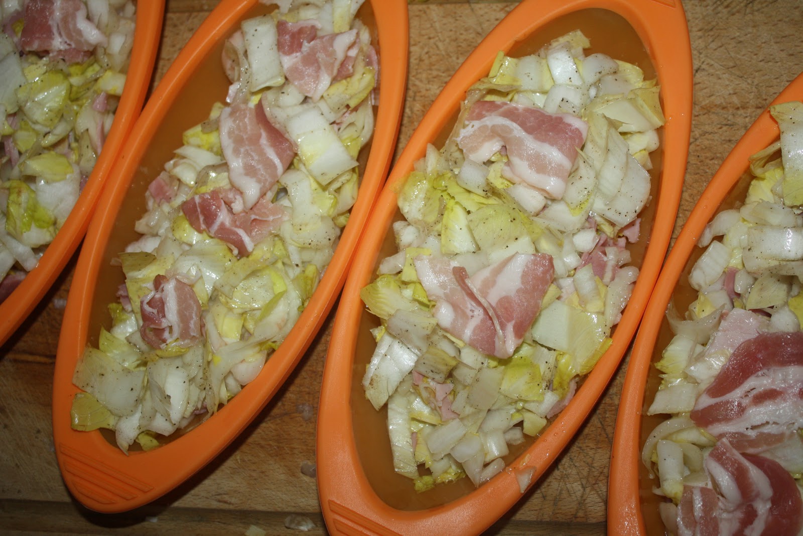 Coupons les 4 tranches de lard en gros morceaux et disposons les part dessus les endives.