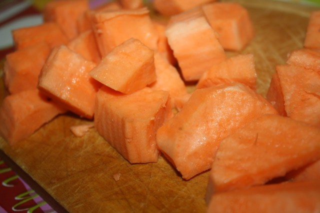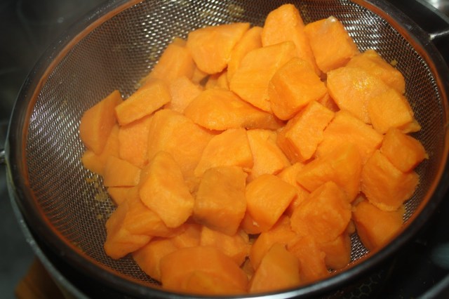 Mettons les patates douce dans une casserole avec de l’eau salé. Laissons cuire 20 minutes.