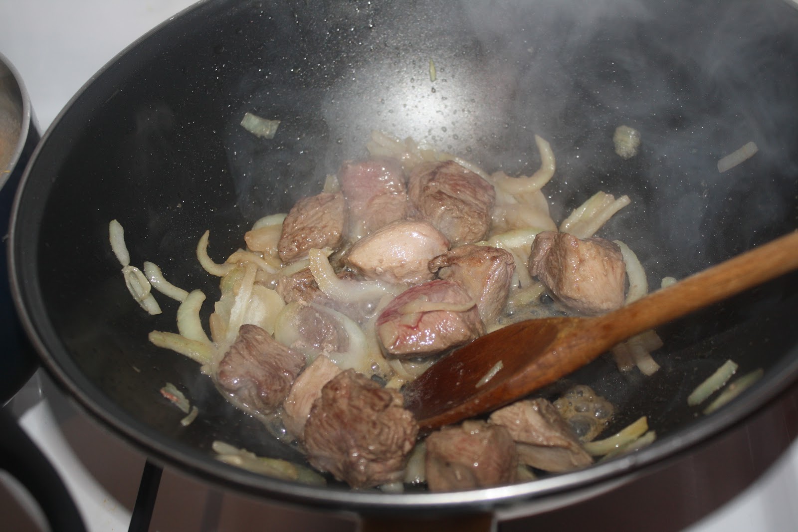Dans une poêle faisons revenir l’oignon dans un peu d’huile d’olive, et le magret de canard.