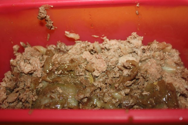 On dispose la viande dans le fond du plat (ici, j’ai choisi d’utilisé mon moule à « terrine »)