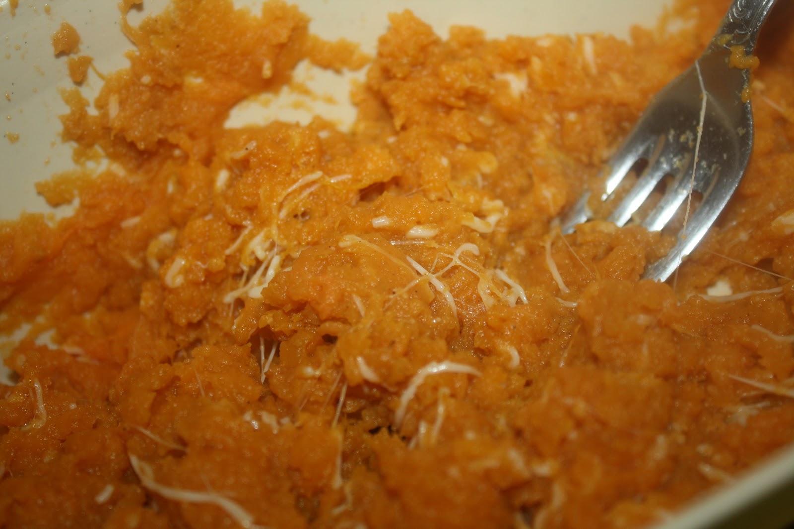 Quand les patates sont cuites, on les écrases, sel et poivre et on mélange la moitié du fromage rapé.
