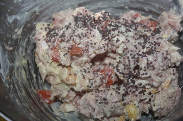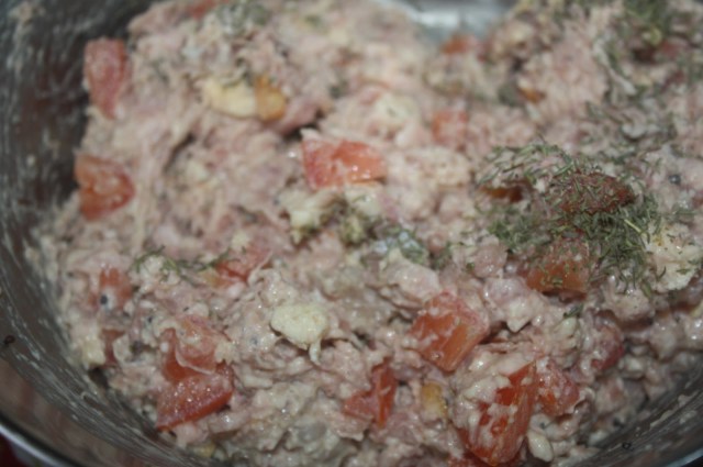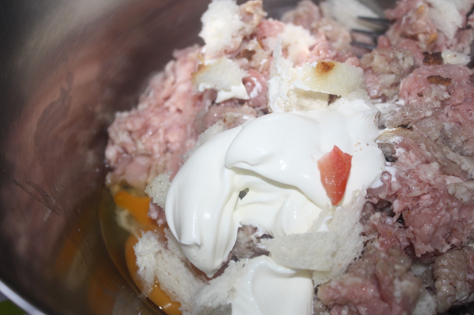 On dispose le hachi dans un récipient, sel et poivre, la crème et l’oeuf. On mélange le tout.