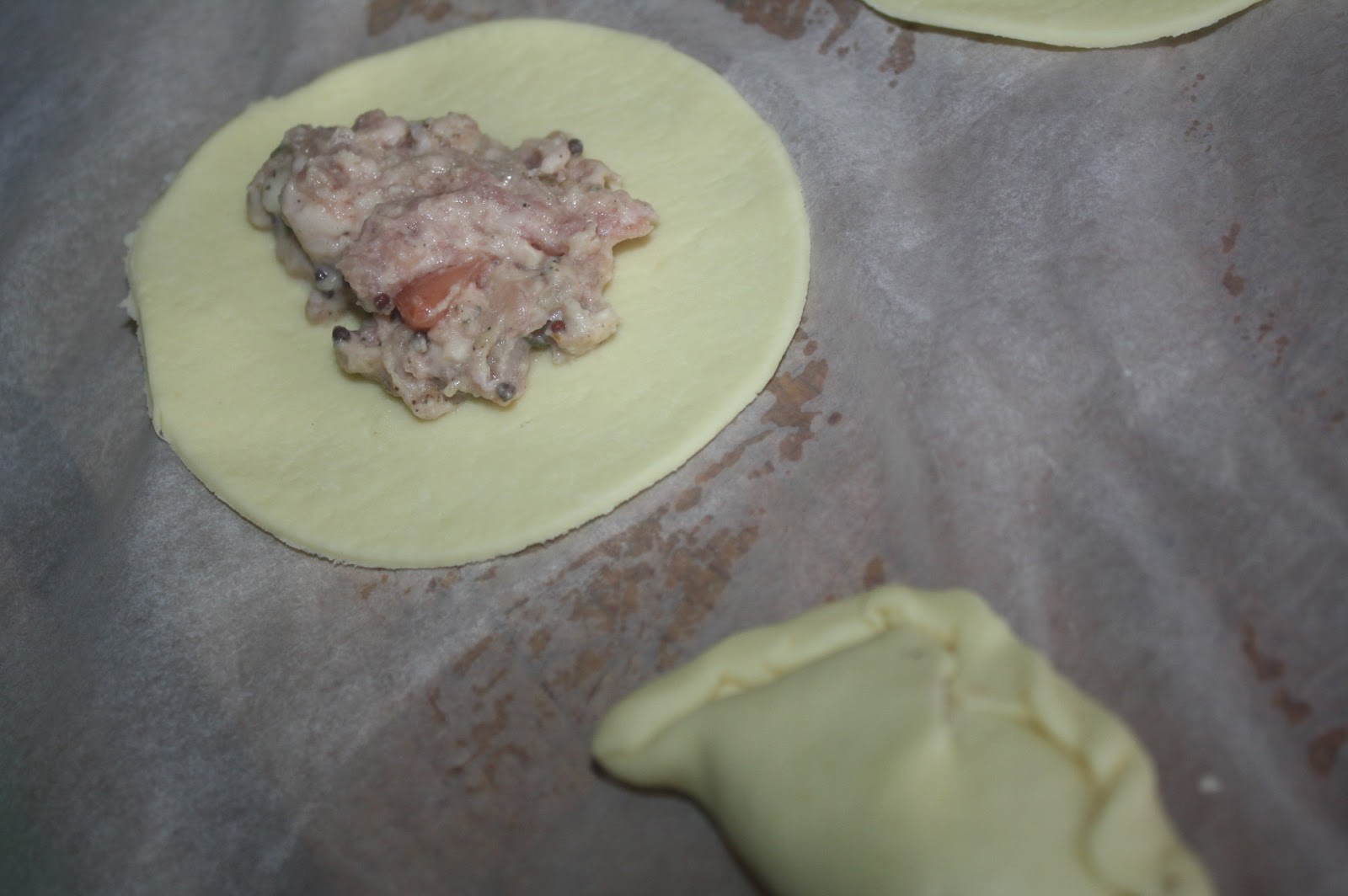 On ajoute un peu de préparation au centre et on pli a deux, de façon a obtenir un demi cercle, puis on repli les bords.