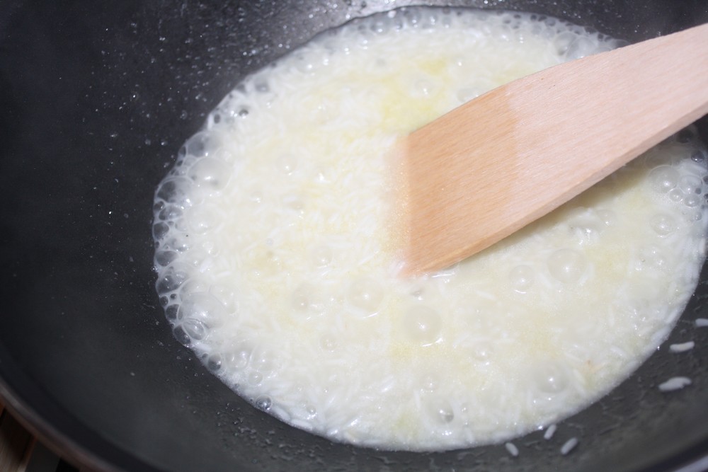 Nous allons commencer par verser le riz dans le wok, y ajouter de l’eau (un peu au dessus du riz), salé et poivré légèrement, car le saumon va s’en charger.