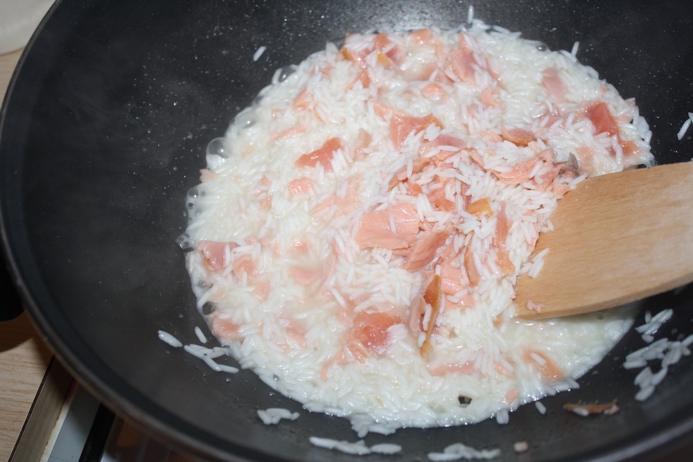 Une fois que le riz est assez cuit, on y insère le saumon et …