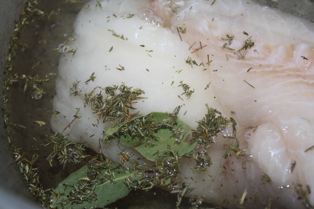 Commençons par plonger le poisson dans de l’eau bouillante et salé. Ajoutons du thym et du laurier. Puis, 2 c à s de jus de citron.