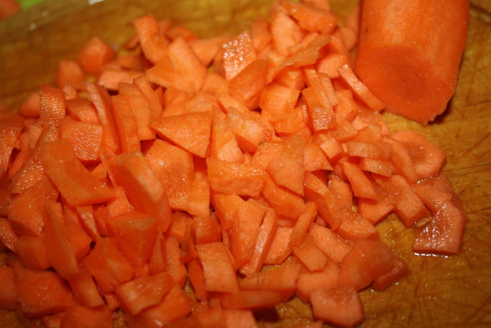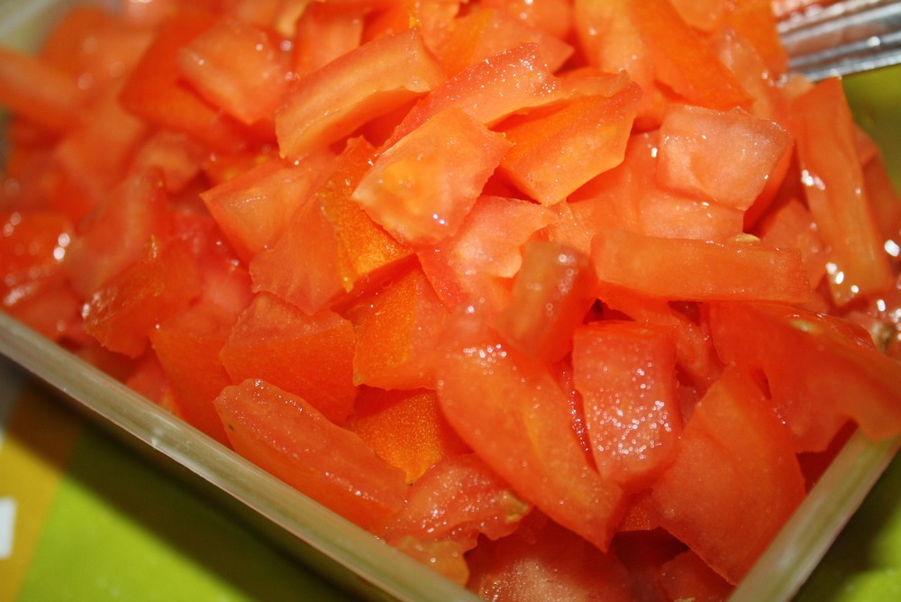 Pendant ce temps, coupons les légumes. Ici j’ai enlevé le jus des tomates, et je les ai coupés en petit dès, pareil pour les carottes.