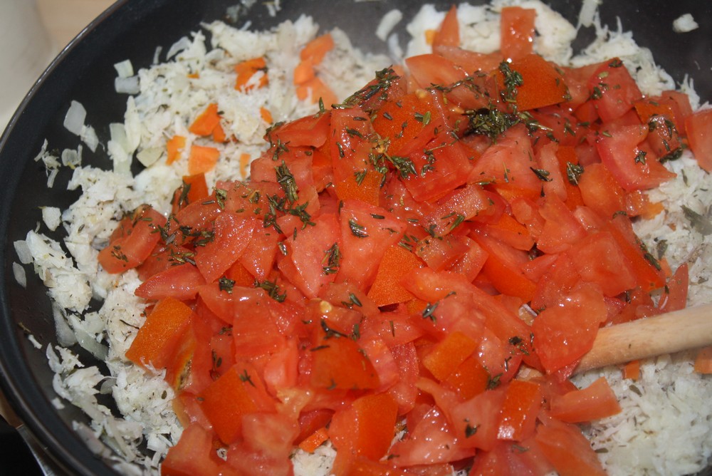 Puis, nous ajouterons le poisson et les tomates aux carottes et oignons.