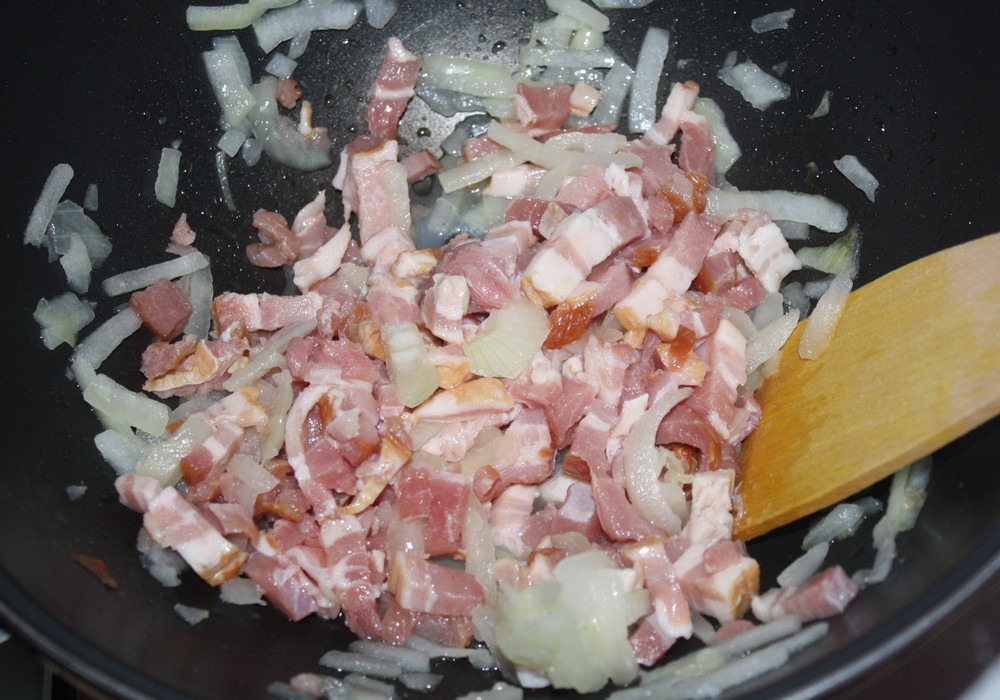 Faisons revenir les oignons dans un peu d’huile d’olive et ajoutons les lardons et une cuillère à soupe de miel. Assaisonnons et laissons les cuire environ 5 minutes.