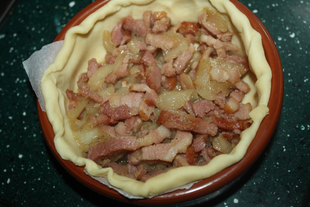 Étalons la pâte et répartissons la préparation de lardons et d’oignons au fond.
