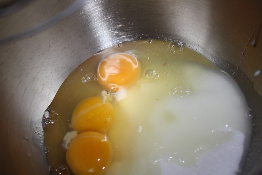 Commençons par mélanger le yaourt et le sucre. Ajoutons les oeufs et mélangeons bien.