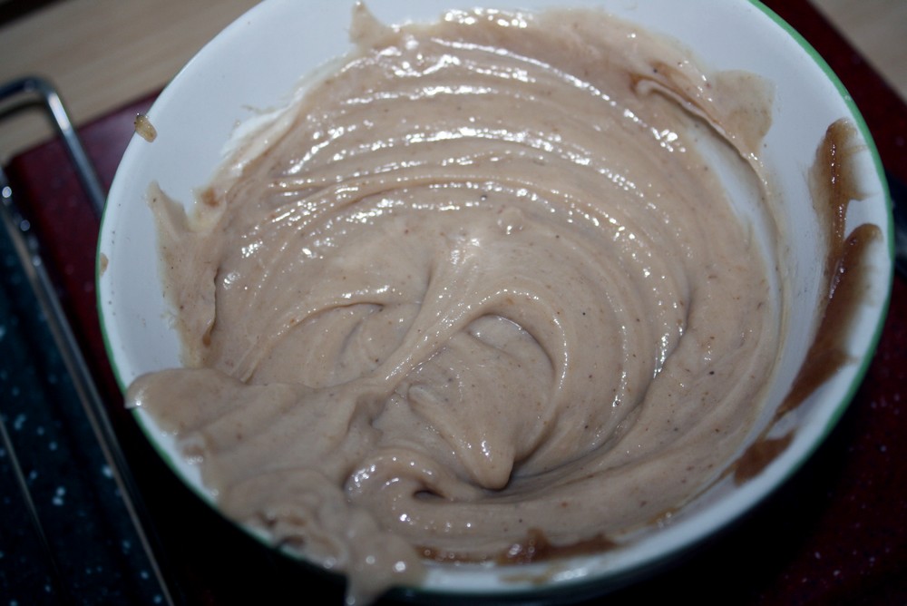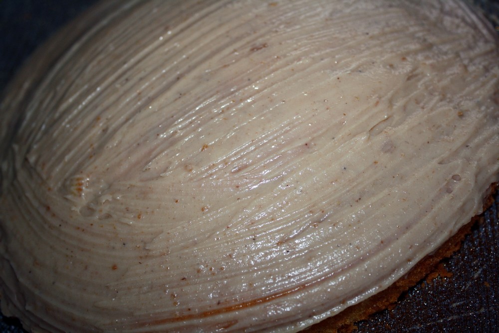 Pour le nappage, il suffit de mélanger la crème de marron qui reste et les 100 gr de mascarpone, et une fois que le gâteau est cuit et qu’il a refroidit, étalons le mélange dessus.