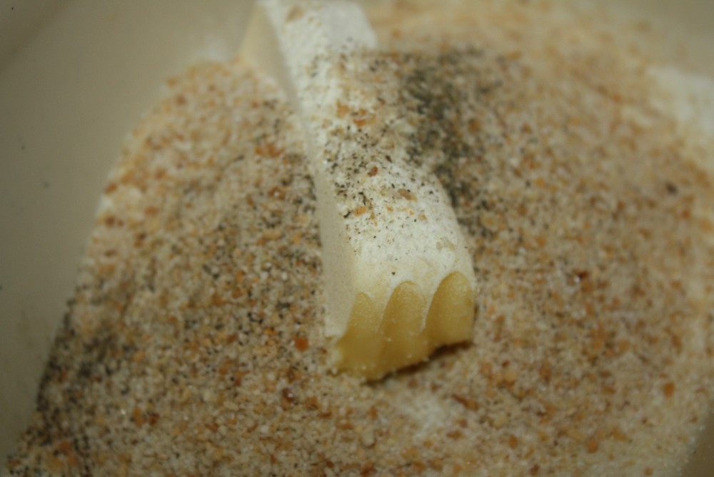 Ajoutons la préparation dans un plat allant au four, puis préparons le crumble. Il suffit de mélanger le beurre, la farine et la chapelure avec les mains, un peu de sel et de poivre et l‘émietter sur la préparation.
