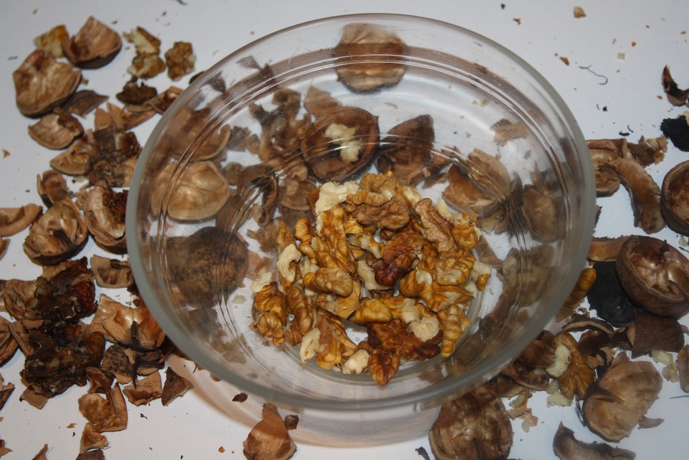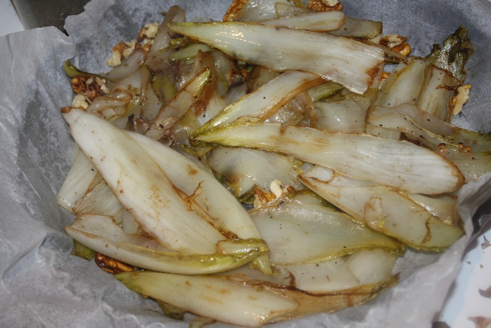Après avoir cassé les noix, faisons revenir les feuilles d‘endive (enlevons l’amertume), ajoutons un peu de poivre.