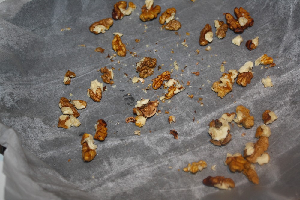 Disposons la feuille de papier sulfurisé dans la tourtière, ajoutons les noix puis recouvrons des endives.