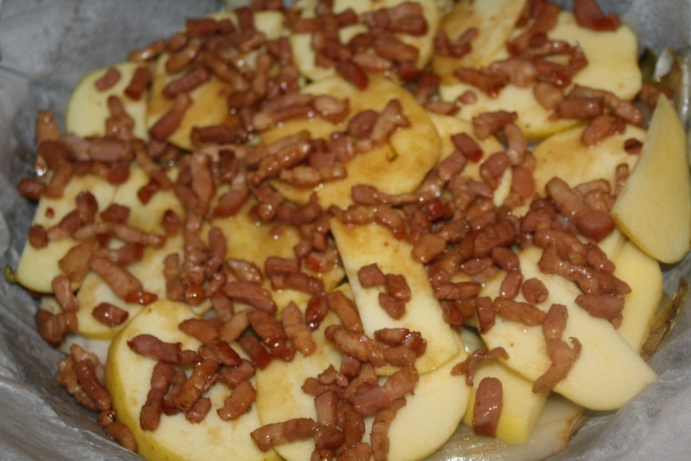 Faisons revenir les lardons, et disposons les part dessus.