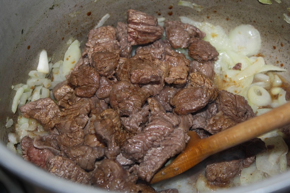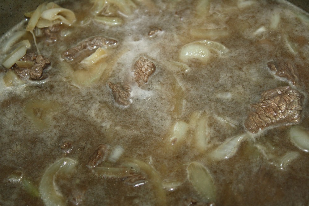 Faisons cuire les oignons après les avoir coupés finement, ajoutons la viande, le sucre, la sauce soja, gingembre, un cube kub-or, couvrons d’eau et laissons mijoter une vingtaine de minutes.