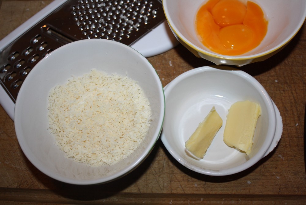Une fois cuit, ajoutons le beurre, le parmesan et mélangeons le tout. Puis, ajoutons les jaunes d’oeufs (en dernier, pour éviter que l’oeuf ne cuise).  Et disposons le au réfrigérateur pour qu’il refroidisse.