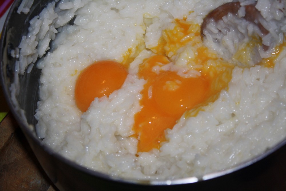 Une fois que le riz est froid, mouillons nos mains pour éviter que le riz ne colle, formons une petite boule dans le creux de la main, faisons un petit trou pour y mettre la farce et recouvrons de riz. Trempons la boule dans les 2 oeufs préalablement battus, puis dans la chapelure.