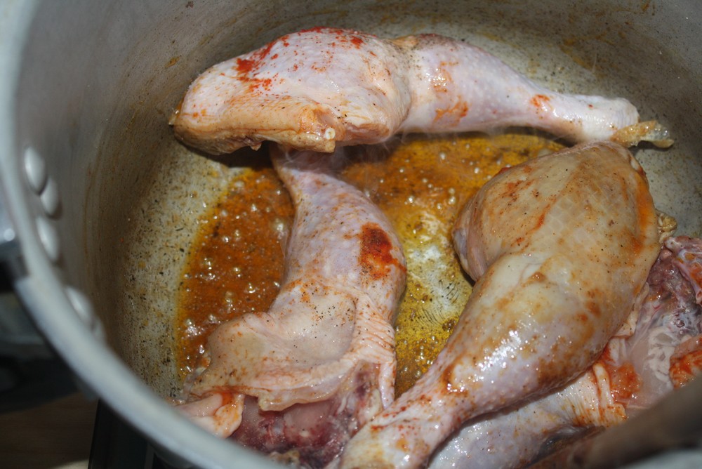 Dans une cocote minute, faisons risoler les cuisses de poulet environ 10 minutes, dans un peu d’huile. Assaisonnons et ajoutons 1 c à s de piment doux.