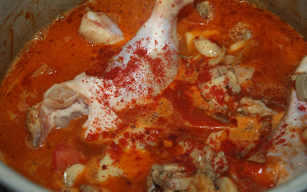 Dans le jus de cuisson du poulet, faisons revenir l’oignon, remettons les cuisses de poulet, ajoutons les tomates préalablement coupés en 4, la sauce Saclà, les champignons, parsemons du reste de piment doux, versons le bouillon et laissons cuire 20 minutes (commençons à compter le temps une fois que la cocotte se met à siffler).