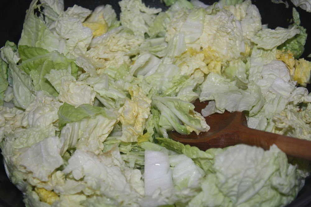 Pendant ce temps, nous couperons le chou en petite lamelle, que nous disposerons dans un wok avec un peu d’huile d’olive. Ajoutons 1l de bouillon de légumes, un peu de graines de sésames, le gingembre, l’oignon, assaisonnons et laissons mijoter le tout environ 30 minutes à feu doux.