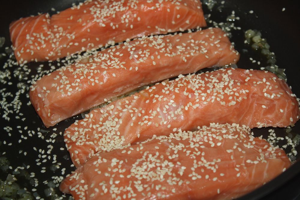 Dans un premier temps, faisons venir l‘échalote préalablement coupé en petit morceau dans un filet d’huile d’olive. Ajoutons les pavés de saumon que nous parsemons de graines de sésames.