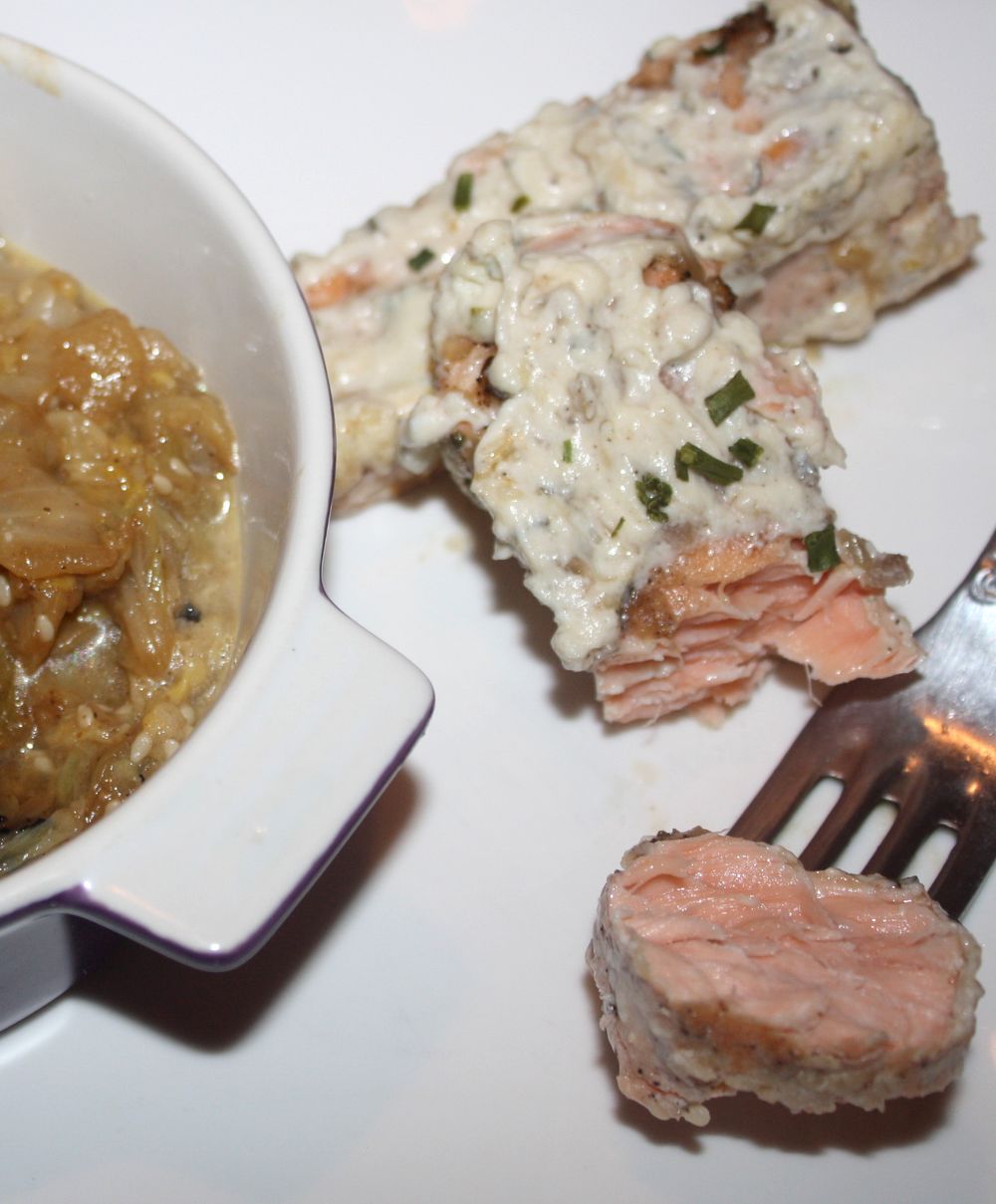 J’ai servi la compoté de chou chinois dans un ramequin, et recouvert le pavé de saumon de sauce ciboulette/citron. Un délice.