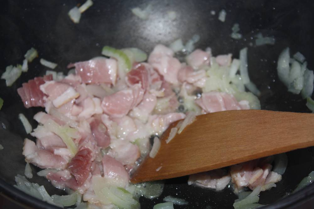 Dans un premier temps, faisons revenir l’oignon, ajoutons le lard fumés coupés en petit bout puis les légumes. Versons 1l d’eau et ajoutons le bouillon bouquet garnis. Laissons mijoter quelques minutes, puis ajoutons le riz. Laissons cuire à feu moyen en remuant régulièrement et en ajoutant de l’eau si besoin.