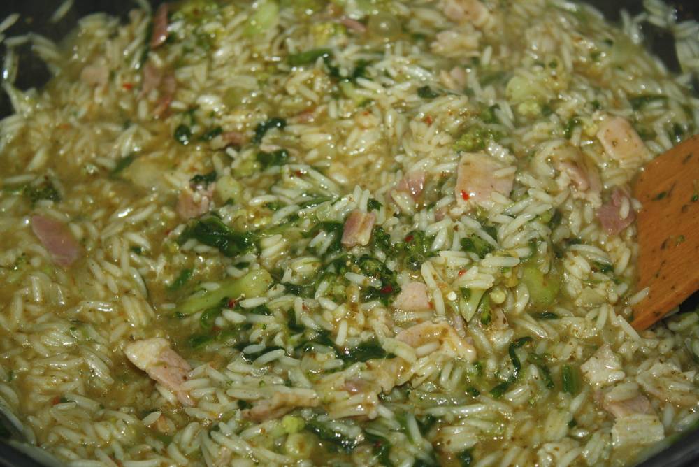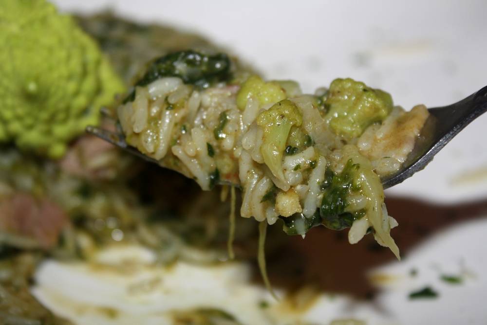 Bref, ce soir, j’ai préparé un bon risotto aux légumes verts (épinards, chou romanesco, brocolis), du pesto d’enfer de mon partenaire Saclà  pour donner un peu de piment et du lard fumé. Un vrai régal.