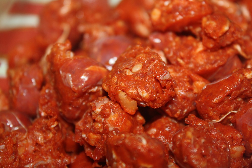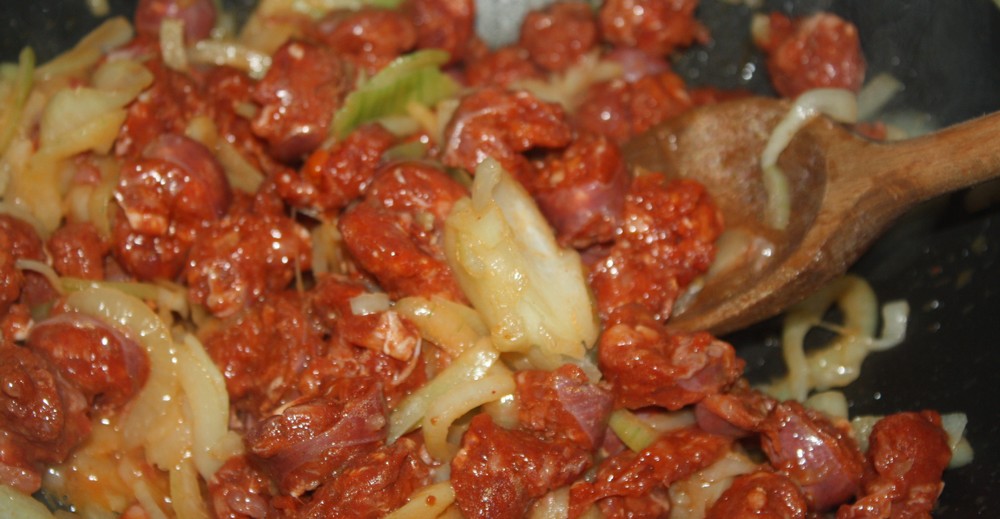 Coupons les merguez en petit morceau, faisons revenir un oignon émincé dans un peu d’huile d’olive. Ajoutons les merguez. Laissons cuire jusqu’à ce que la viande colore.