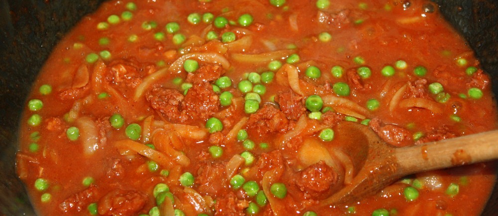 Ajoutons la purée de tomate puis les petits pois. Assaisonnons, puis ici, j’ai ajouté une pincée de paprika.
