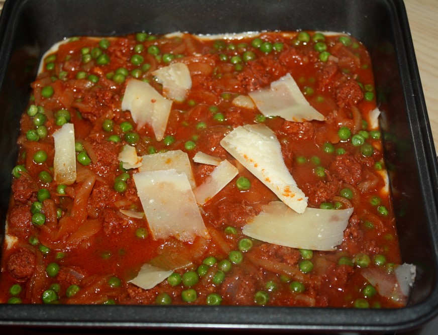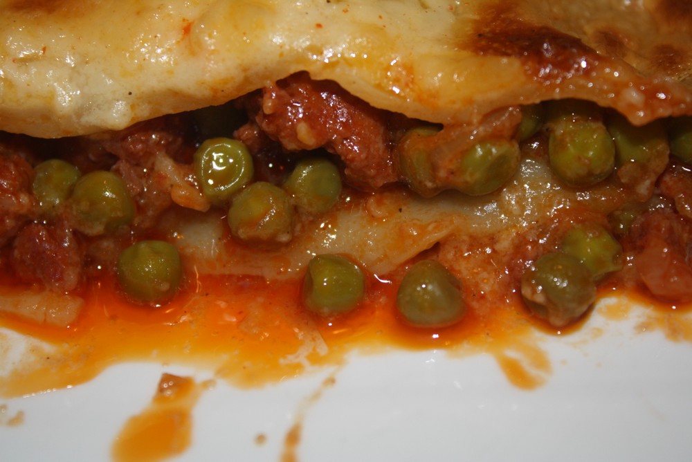 Je me suis lancée dans une recette totalement inconnue (bon d’accord, je fais souvent ça.. hi hi), des lasagnes aux merguez que j’ai mélangé avec des oignons et des petits pois. J’ai ensuite fait une béchamel assaisonnée au paprika pour relever un peu plus le goût car j’ai utilisé des merguez douce.