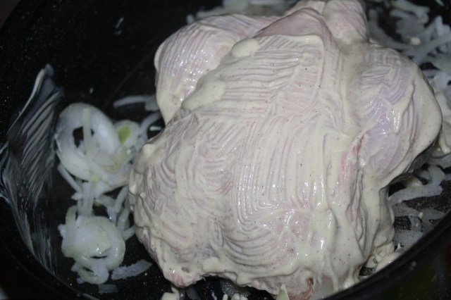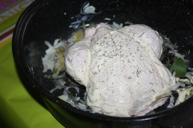 On mets le poulet dans la cocotte, de l’huile d’olive et les oignons