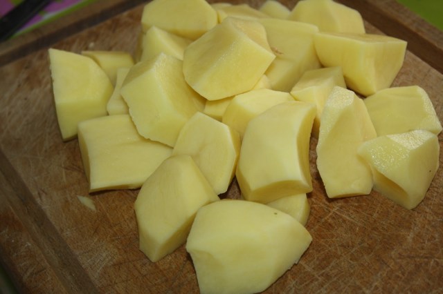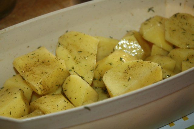 On coupe les pommes de terres en quatre, et on badigeonne d’huile d’olive et de thym.