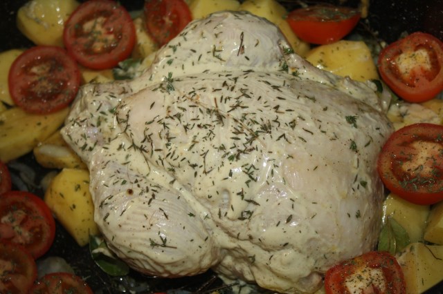 On préchauffe le four à 180° et on fait cuire environ 1 h (différent selon les fours, piquer de temps en temps les pommes de terre et le poulet ).–