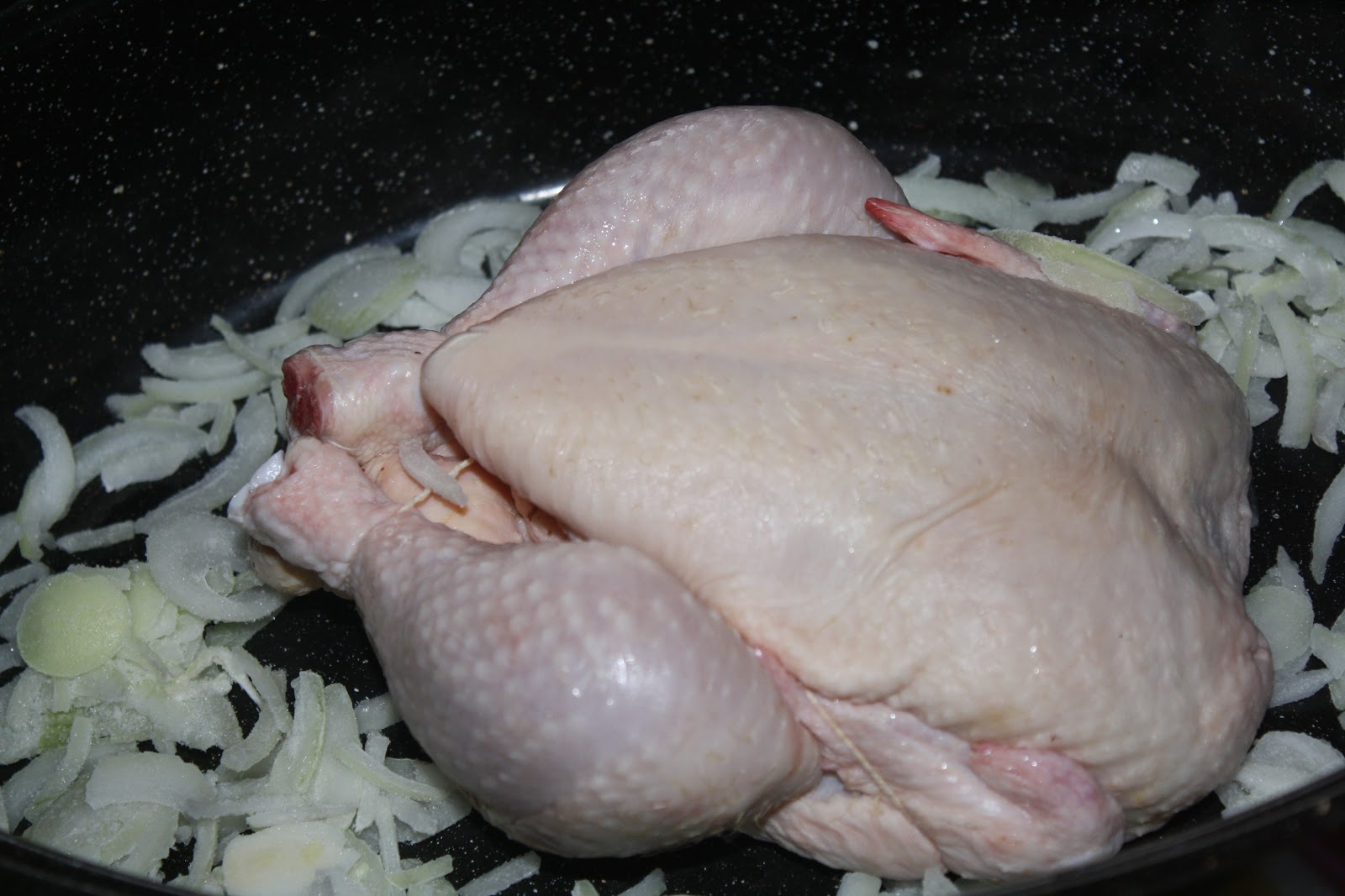 On mets le poulet dans la cocotte, de l’huile d’olive et les oignons