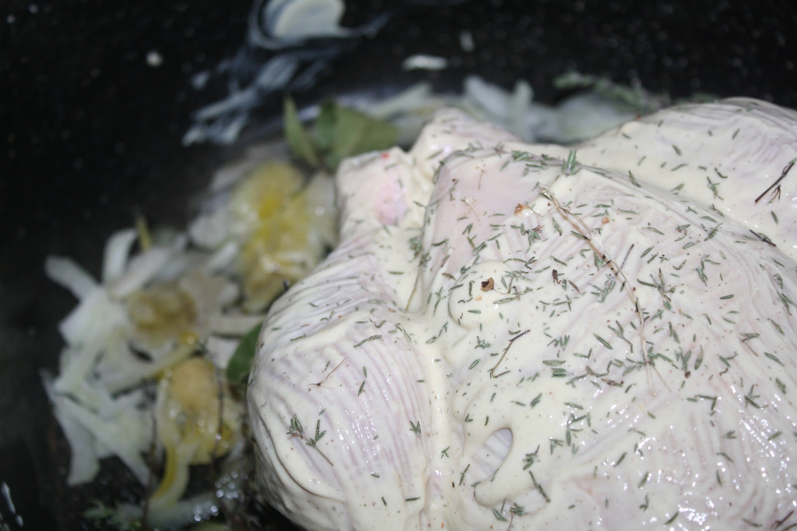 On aromatise le poulet avec le thym et on peut mettre du laurier