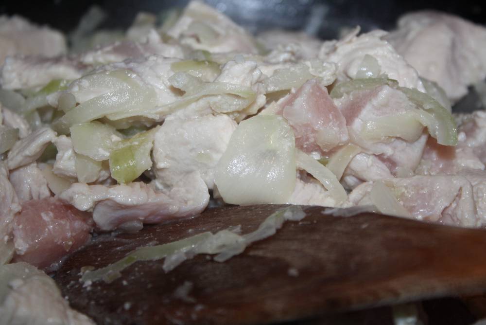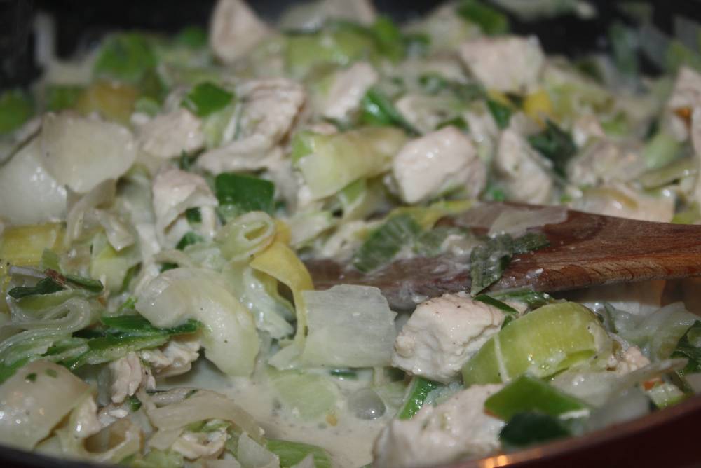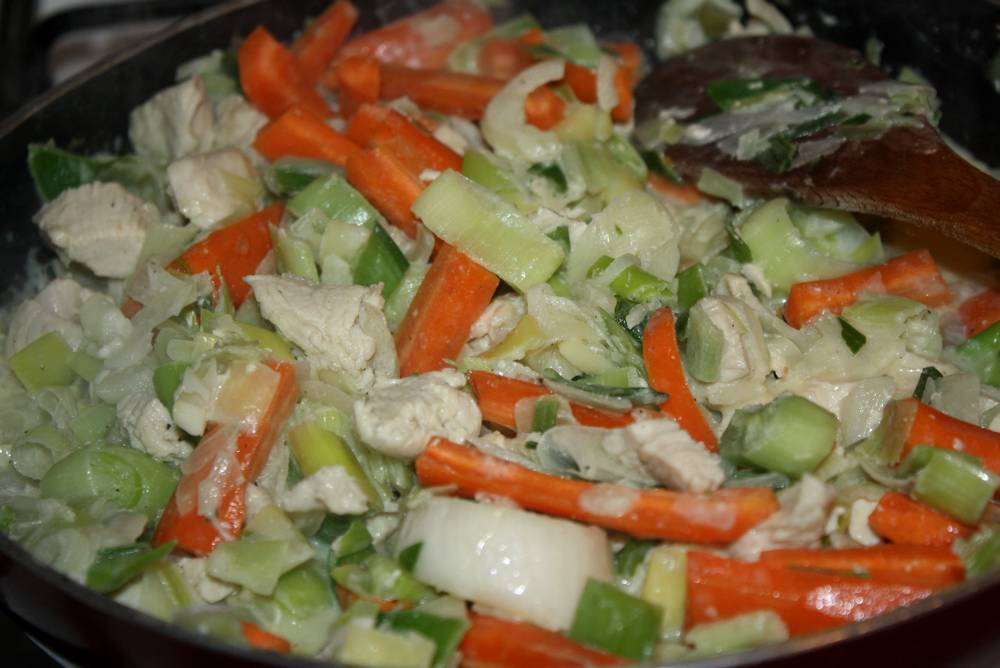On commence par faire revenir les oignons dans un fond d’huile d’olive, on y ajoute le poulet, poireaux et carottes.  On laisse mijoter à feu doux environ 10 minutes.