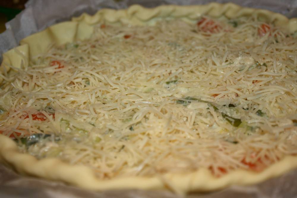 Hors feu, on ajoute la crème, les œufs et on assaisonne à sa guise. On étale le tout dans la tourtière et on recouvre de fromage râpés. On mets au four pour 30 minutes environ à 180 °.
