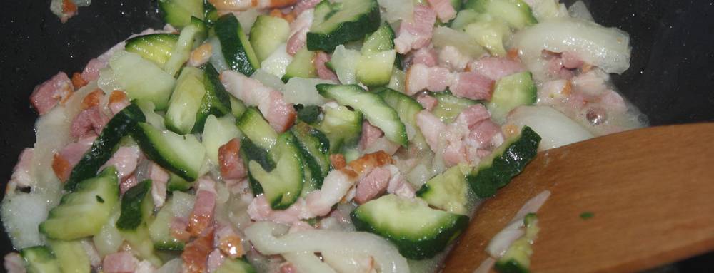 Mais que faire ce soir ? Bon un bol de soupe suffit, mais il me faut mon déjeuner de demain voyons ! Je vais vous dire, je suis partie encore à l’aveuglette sur cette recette.. Lardons et champignons .. ok ça se marient très bien ensemble. Et si on y ajoutait un peu de courgettes histoire de se donner bonne conscience (5 fruits et légumes par jour.. hi hi).