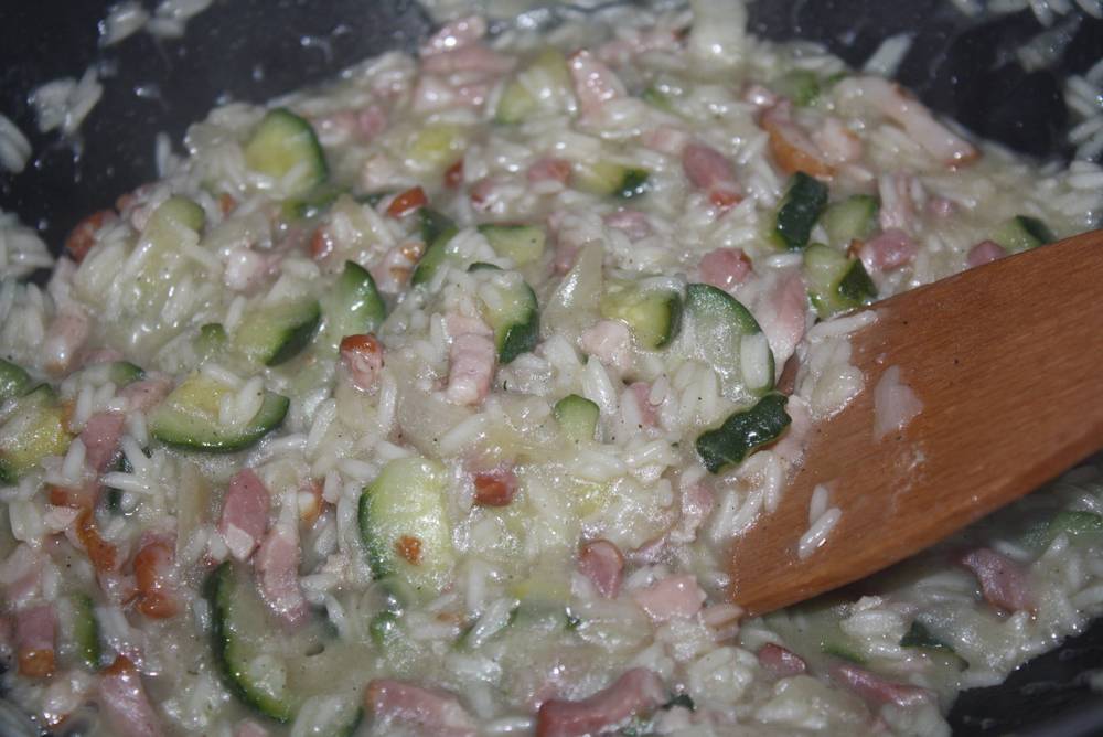 Dans un premier temps, faisons revenir nos oignons dans un peu d’huile d’olive. Ajoutons les lardons. Laissons cuire quelques minutes. Ensuite, nous pouvons intégrer les courgettes préalablement coupés en petit morceau. Laissons cuire quelques instant. Nous pouvons ajouter le riz. Faisons cuire un peu et ajoutons petit à petit le bouillon à feu moyen. Mélangeons régulièrement et ajoutons le bouillon petit à petit.